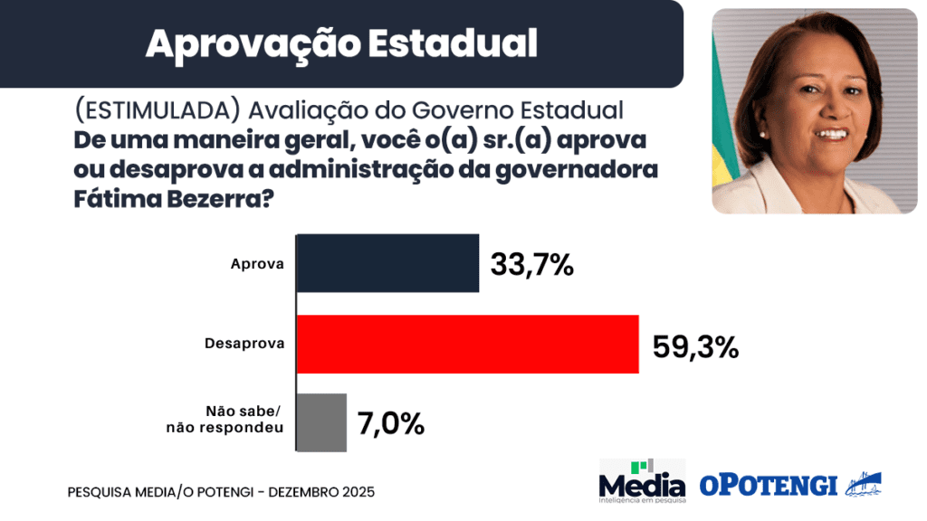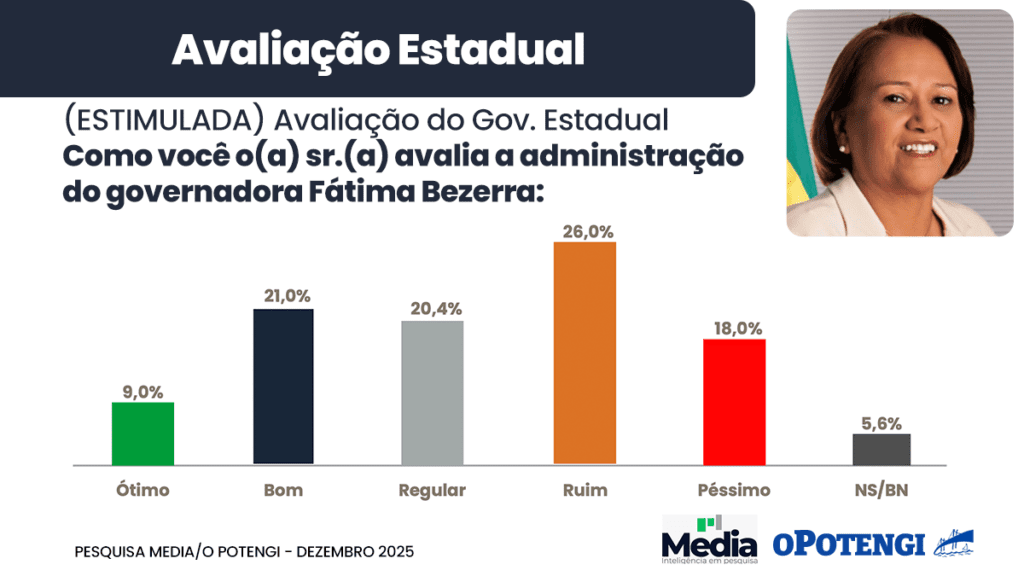 A pesquisa Media/O Potengi, realizada entre os dias 14 e 16 de dezembro de 2025, mediu como os potiguares avaliam as gestões federal, estadual e municipais. Os dados revelam um cenário de divisão no apoio ao presidente Lula (PT) e uma alta taxa de desaprovação à governadora Fátima Bezerra (PT).