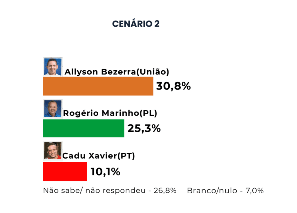 Em cenário alternativo, com o senador Rogério Marinho candidato no lugar de Álvaro Dias, quem assume a liderança é o prefeito de Mossoró Allyson Bezerra. Neste cenário, o contingente de brancos, nulos e indecisos salta para 33,8%. Confira: