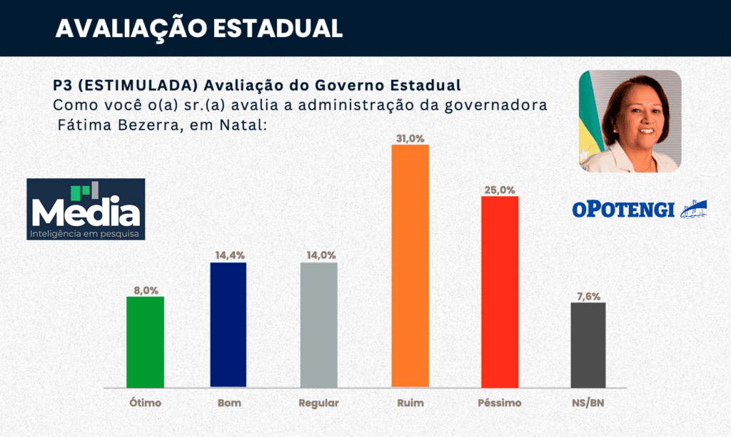 A governadora do Rio Grande do Norte, Fátima Bezerra (PT), enfrenta alta rejeição entre os eleitores de Natal, segundo pesquisa exclusiva realizada para o jornal O Potengi pelo Instituto Media Inteligência em Pesquisa. O levantamento foi conduzido nos dias 4 e 5 de dezembro de 2025, com 1.000 entrevistas presenciais, e apresenta margem de erro de 3 pontos percentuais, com intervalo de confiança de 95%.
