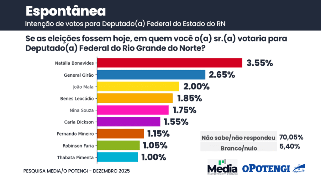 Levantamento realizado pelo Instituto Media entre os dias 14 e 16 de dezembro de 2025, divulgado com exclusividade pelo Jornal O Potengi, mostra a deputada federal Natália Bonavides (PT) na liderança da intenção de voto espontânea para a Câmara dos Deputados no Rio Grande do Norte.