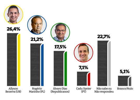 A mais recente pesquisa de intenção de voto para o governo do Rio Grande do Norte, realizada pelo Instituto Media em parceria com o jornal O Potengi, revela um cenário de indefinição e múltiplos empates técnicos entre os principais pré-candidatos. Embora Allyson Bezerra (União Brasil) apareça numericamente à frente em todos os cenários estimulados, os resultados mostram disputas apertadas, com outros nomes como Rogério Marinho (PL), Álvaro Dias (Republicanos), Styvenson Valentim (PP) e Cadu Xavier (PT) figurando em posições competitivas.