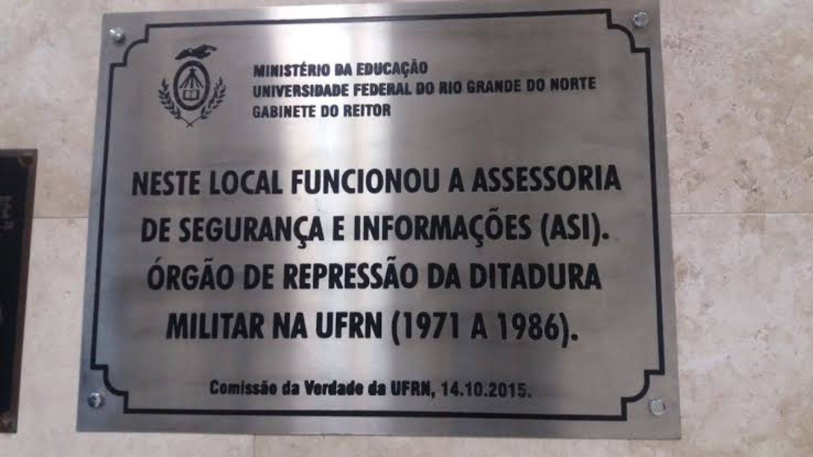 Ícone de crédito As marcas da ditadura são até hoje lembradas na UFRN. Essa placa está situada na Biblioteca Central. Foto: Reprodução/UFRN